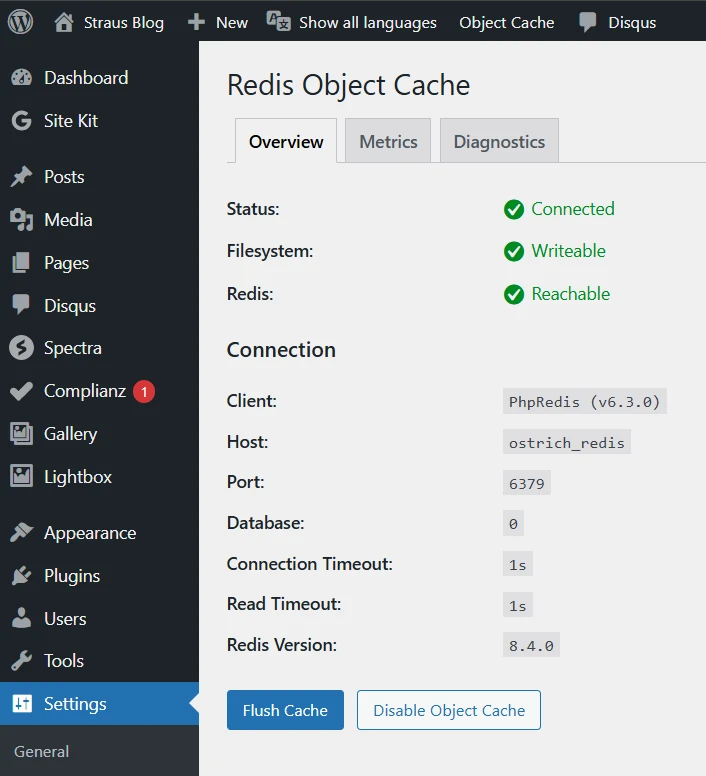 Since my WordPress setup runs in Docker containers, I decided that the most logical step was to launch Redis as a separate service within the same network. This allowed me to move “heavy” queries from the disk to RAM, making the site—and especially its admin panel—much more responsive and pleasant to use.