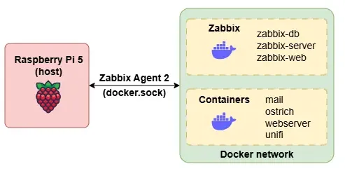 In this architecture, the Raspberry Pi acts as the physical host where Docker is running and all services are launched as containers, including the Zabbix Server, the database, the Zabbix web interface, and other application containers.