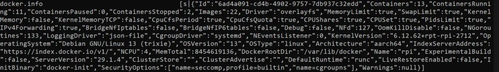 This command tests the agent’s Docker plugin locally. If the access rights to the Docker socket are correct, the command returns structured information about Docker (version, number of containers, daemon state), confirming the correct configuration of the agent and its readiness to collect metrics.