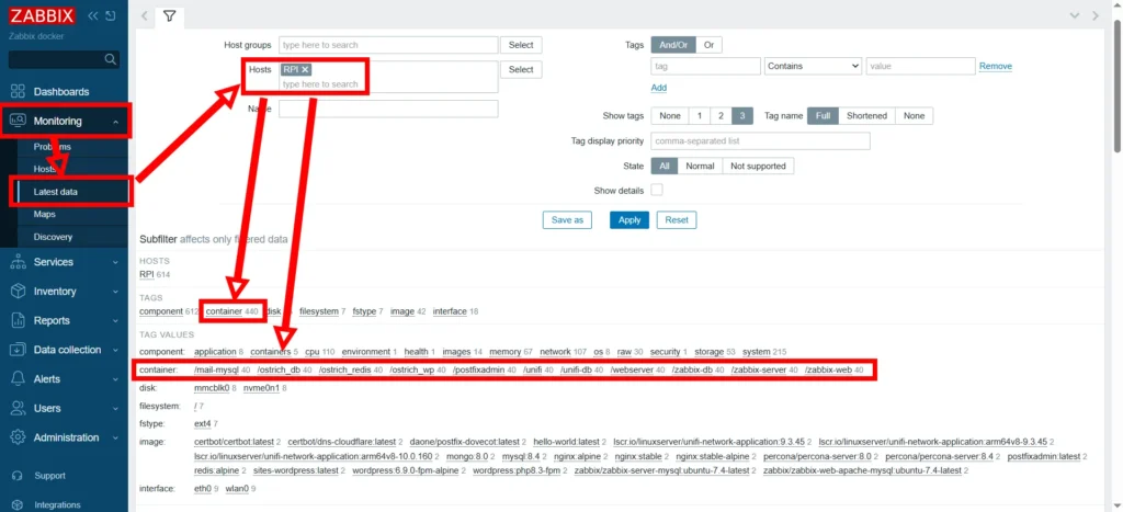 To ensure that data is being collected, go to the Monitoring -> Latest data menu and select my host (RPI) in the Hosts filter.
