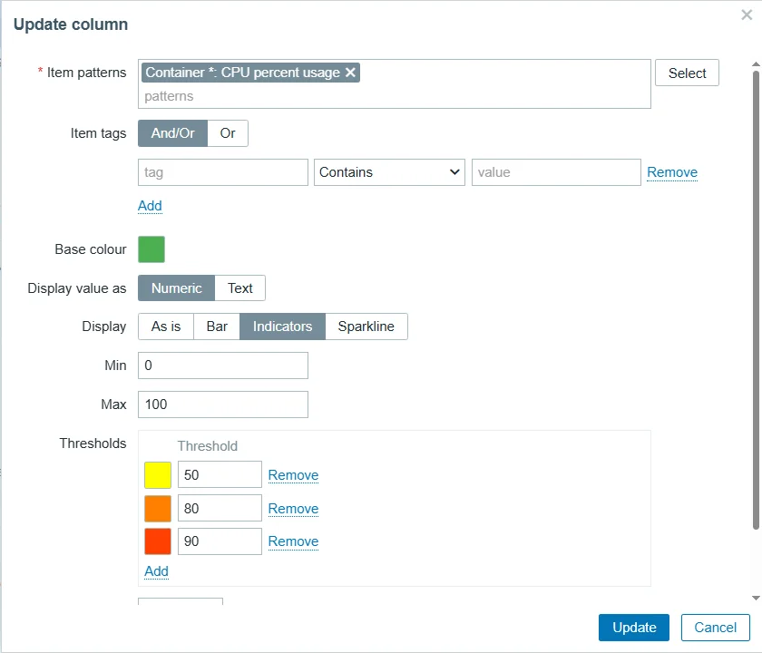 To improve visualization, in the Update column settings, the item pattern Container *: CPU percent usage is applied with a green base color and Indicators display mode (range 0 to 100%). Additionally, thresholds (50, 80, 90) are configured to change the indicator color to yellow, orange, and red, respectively.