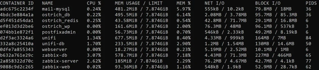 Of course, you can simply go to the console and type docker stats. It will display basic information about resource usage. However, the docker stats utility looks rather dull.