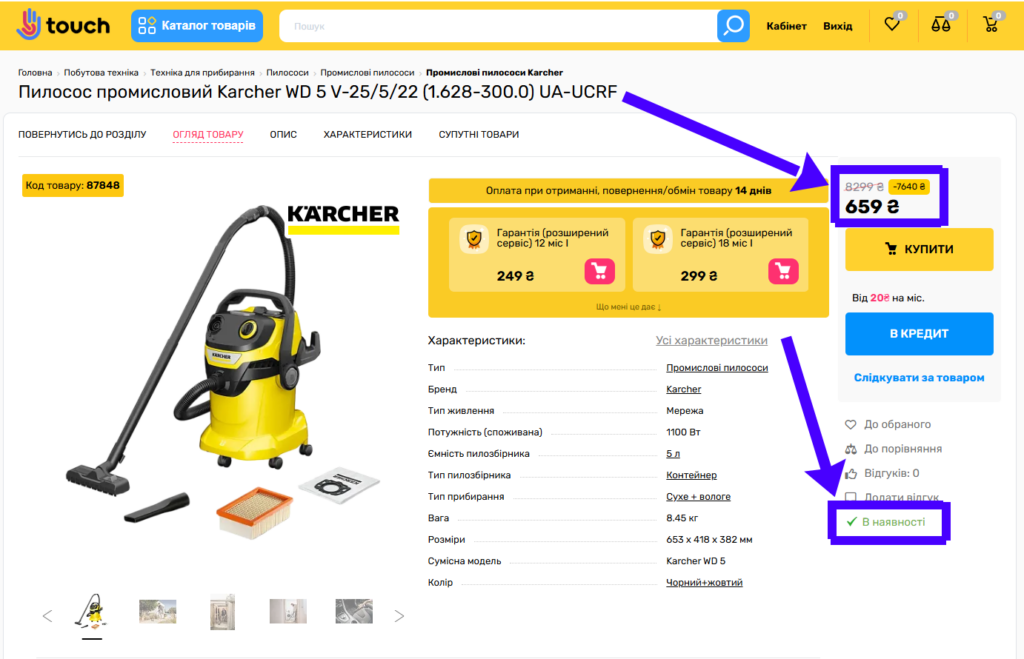 На моє здивування, на сайті товар був дійсно за вказаною ціною. Щоб визначити чи це не глобальна помилка я подивився на інші моделі пилососів цього магазину, і зрозумів, що така дивна ціна вказана лише на одну модель. Також на сайті було зазначено, що модель в наявності.