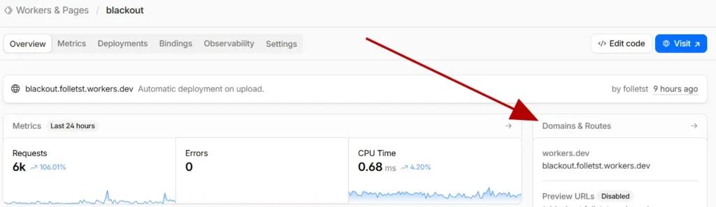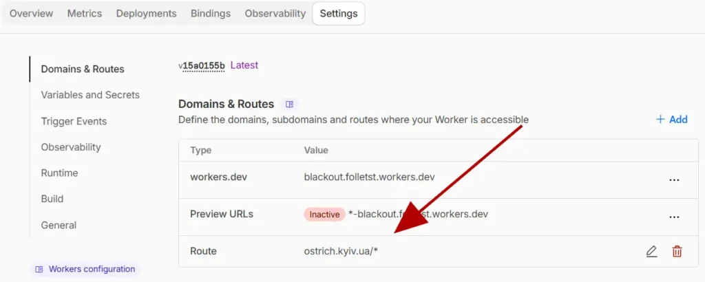 На головній сторінці створеного воркера, переходимо в розділ “Domains & Routes”, щоб усі запити до сайту проходитили через Worker.