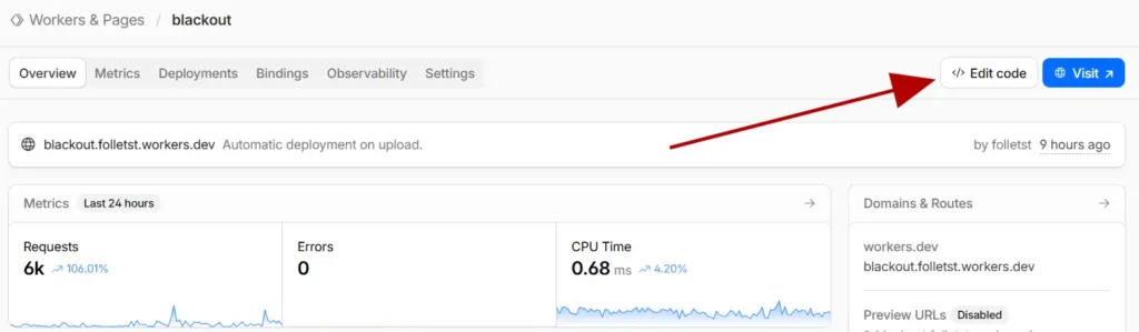 На наступному кроці необхідно відредагувати щойно створений скрипт, для цього клацаємо на ньому та переходимо на основну сторінку цього воркера, де клацаємо на кнопку “Edit code“.