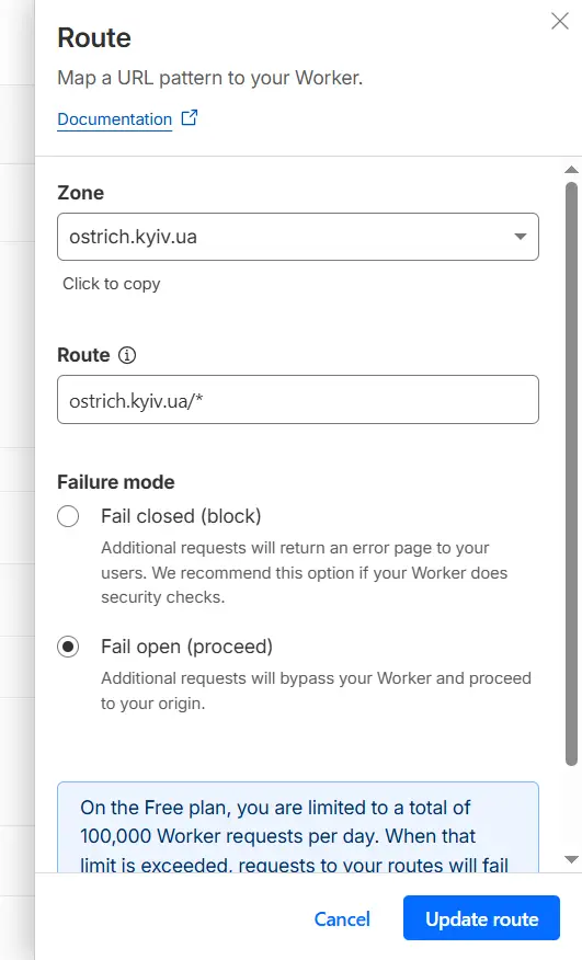 - Failure mode – вибираємо Fail open (proceed), щоб наш сайт продовжував працювати не дивлячись на те, чи працює сам воркер чи ні, щоб ми від нього не очікували ніякої помилки.