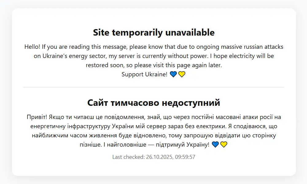 <p>Hello! If you are reading this message, please know that due to ongoing massive russian attacks on Ukraine's energy sector, my server is currently without power. I hope electricity will be restored soon, so please visit this page again later. <br>Support Ukraine! 💙💛</p>