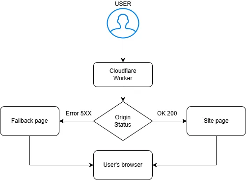 Тобто варто уявити Cloudflare Worker як посередника між користувачем і сервером на Raspberry Pi. Кожен запит до сайту спочатку проходить через мережу Cloudflare, де Worker перевіряє, чи доступний основний сервер. Якщо все працює, запит просто передається далі, ніби нічого й не відбувалося. Але якщо з’єднання з Raspberry Pi розірвано або сервер не відповідає вчасно, Worker миттєво підхоплює управління і показує власну fallback-сторінку.