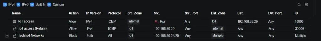 Тут є важливий нюанс, пов’язаний з обладнанням Ubiquiti. Автоматичні правила на кшталт Isolated Networks або IoT access (Return) не можна редагувати, а головне – вони не підтримують логування. Це означає, що навіть коли фаєрвол блокує трафік між VLAN, ці події не з’являються ані у Flow, ані у подіях, ані у системних логах.