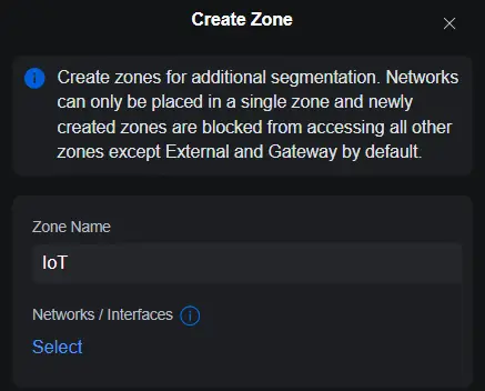 Важливо пам’ятати про особливість маршрутизації Ubiquiti: усі мережі за замовчуванням потрапляють до зони Internal, тому для ізоляції IoT-сегменту потрібно створити власну зону – наприклад, IoT Zone – і застосовувати політику міжзонного фільтрування.